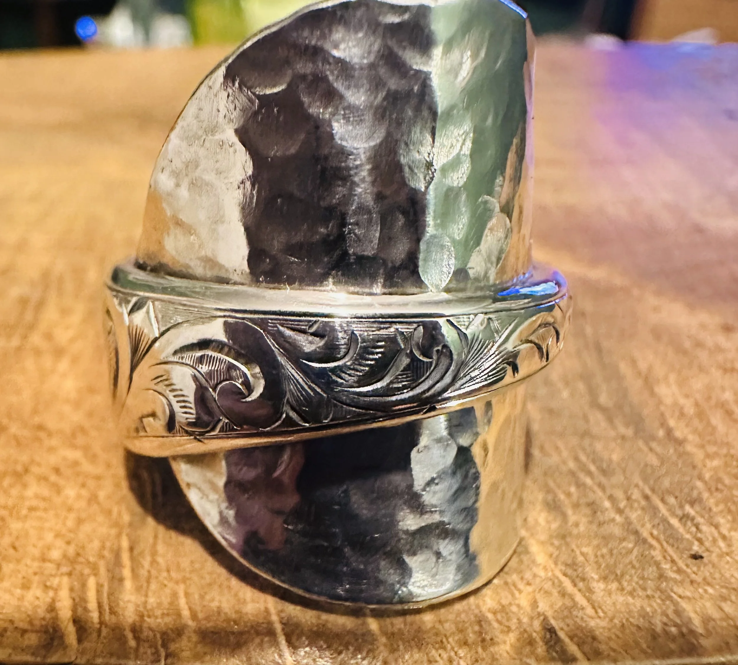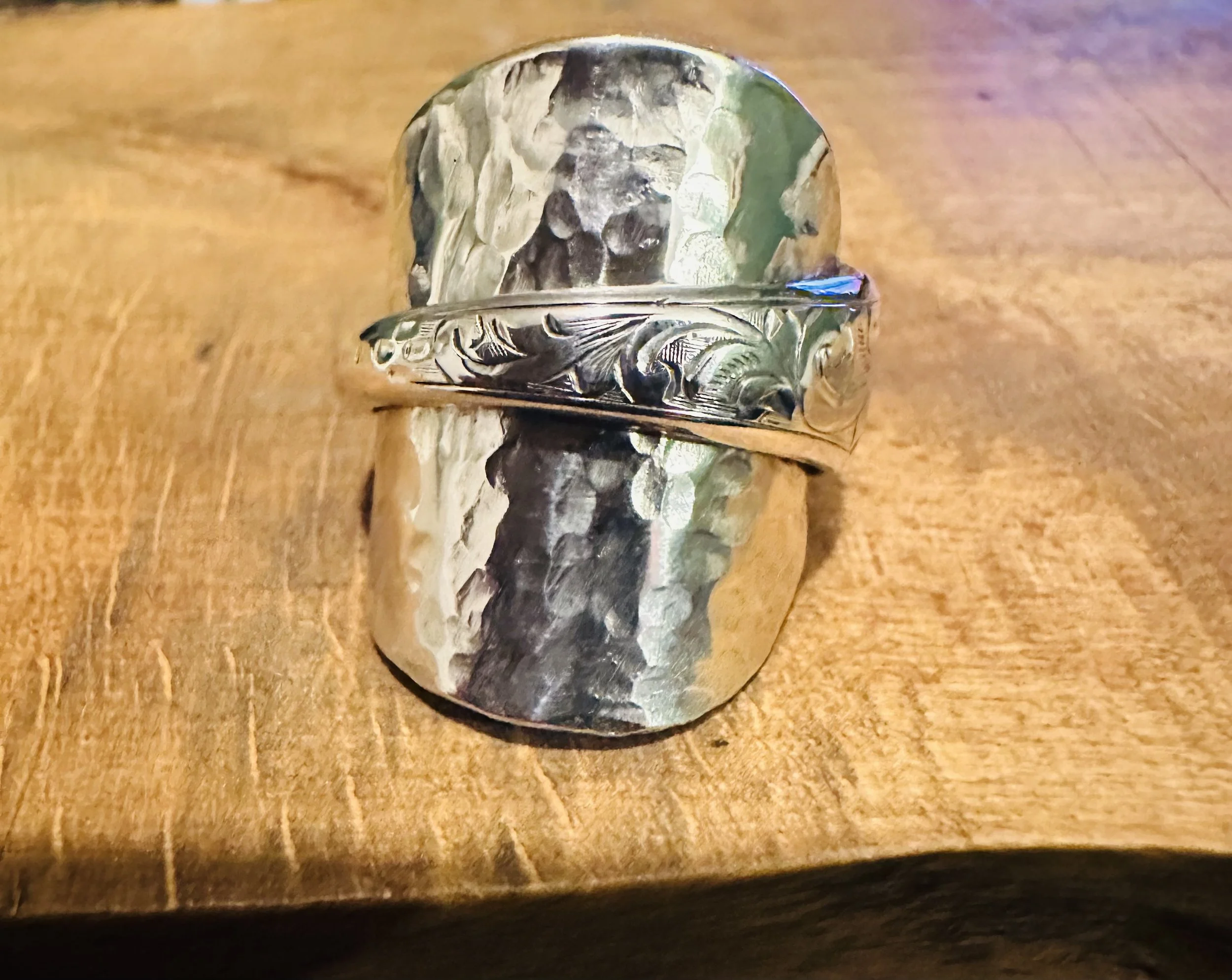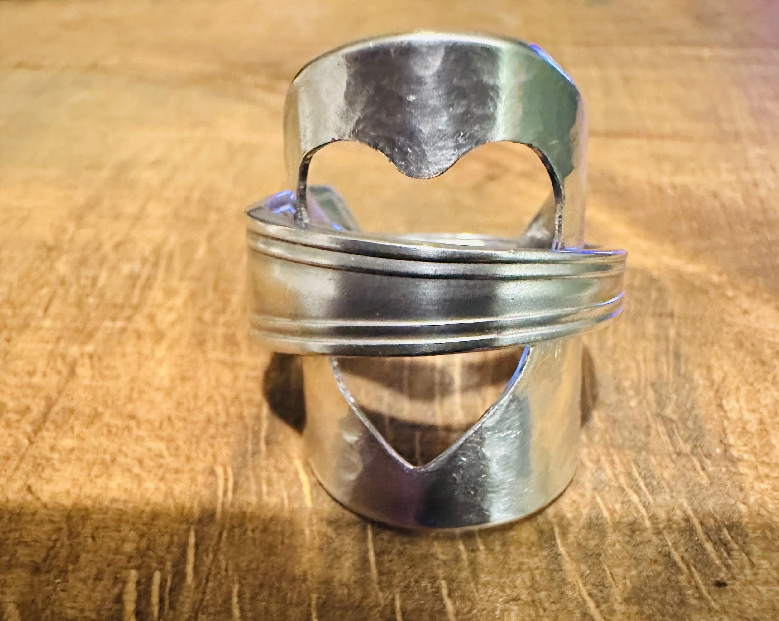 Spoon ring handcrafted from a Birmingham 1938 silver coffee spoon. The spoon bowl has been hammered with a heart cut out