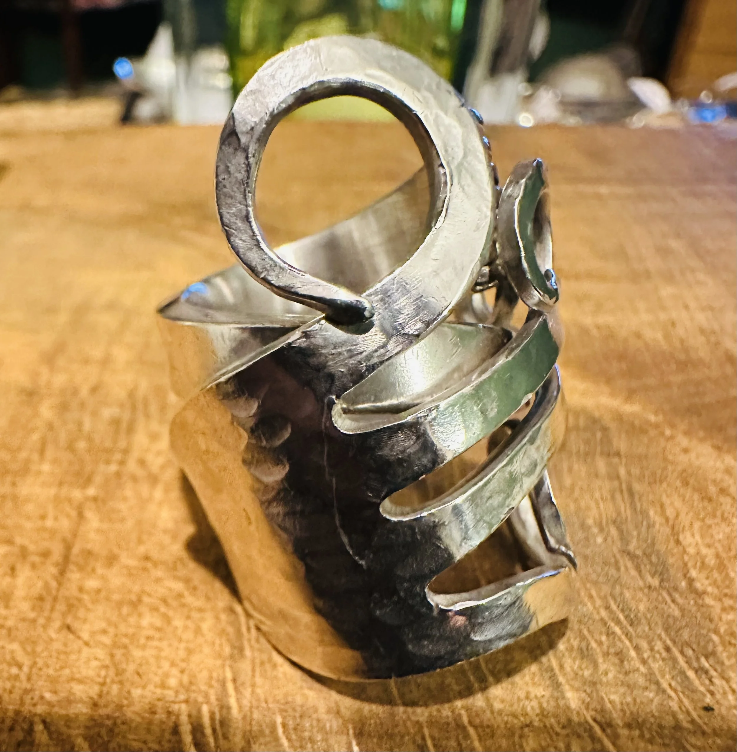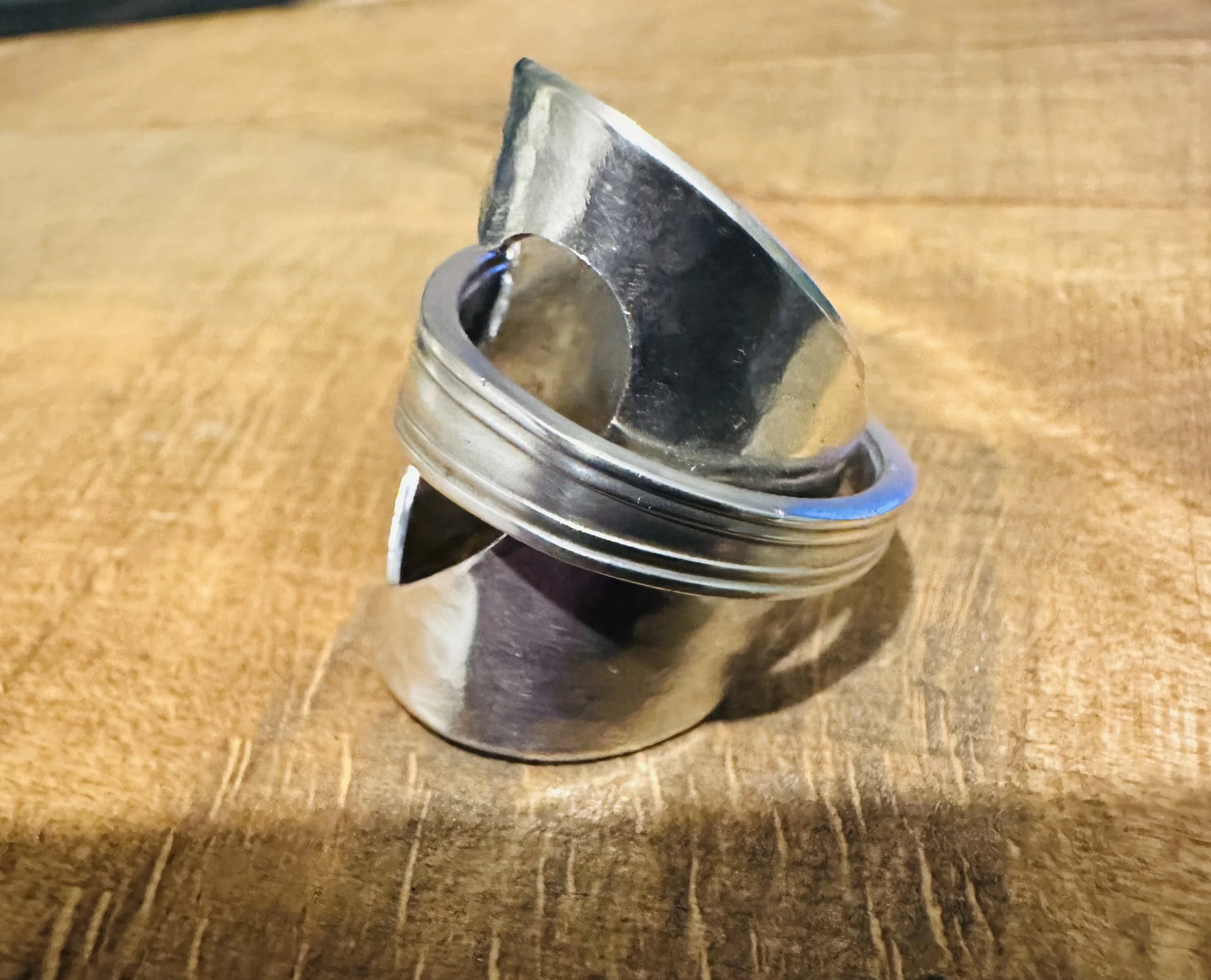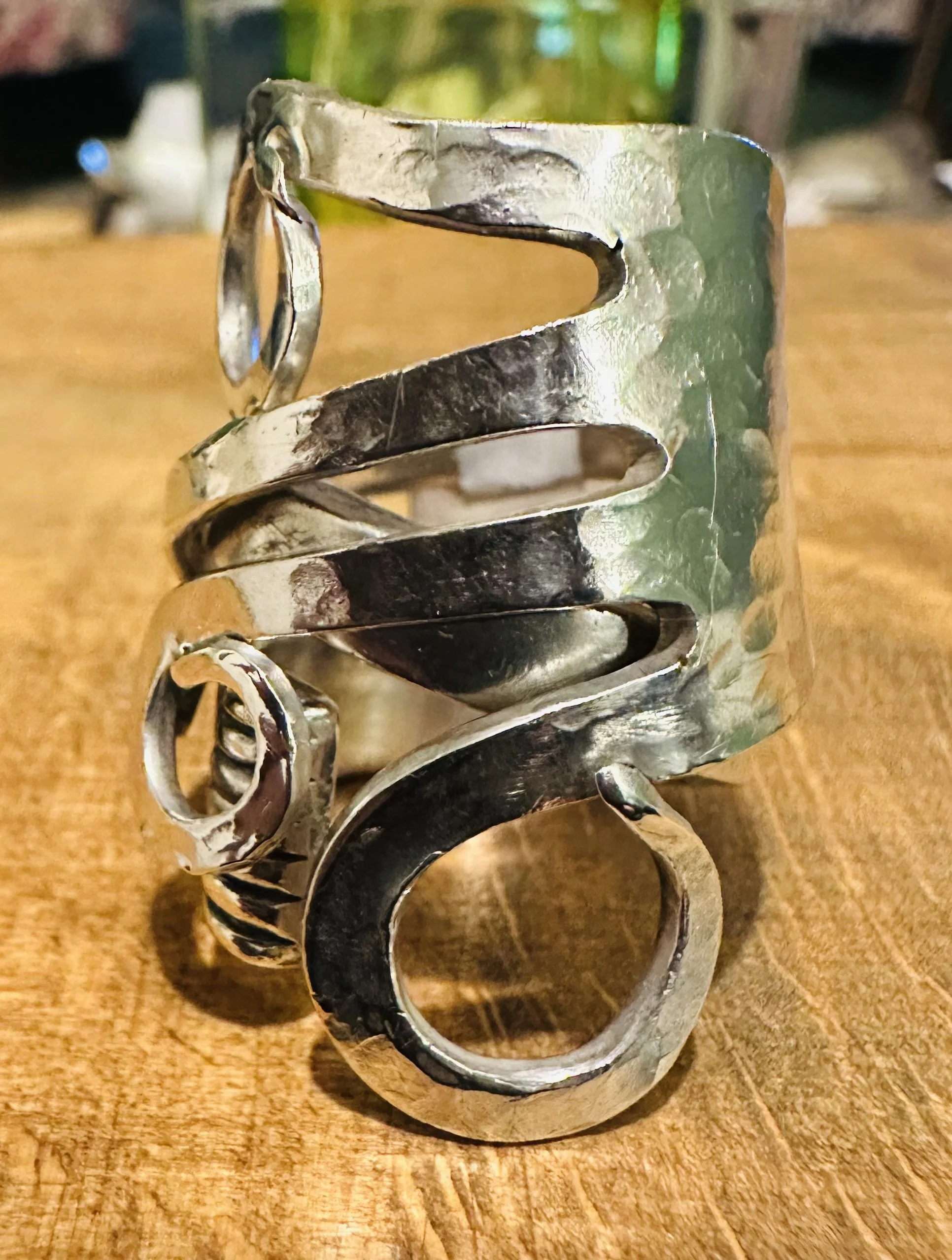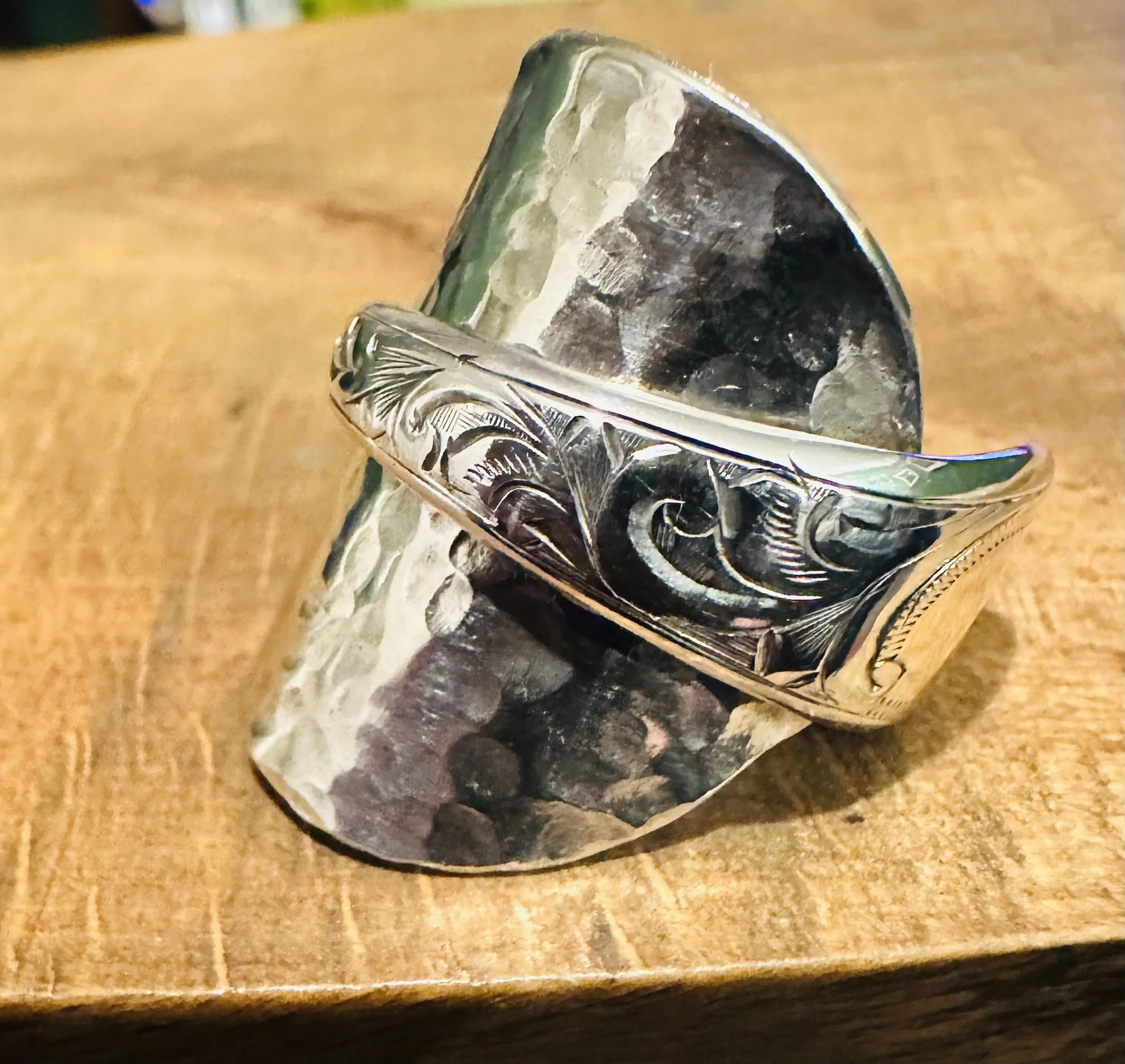 Spoon ring handcrafted from a Birmingham 1938 silver coffee spoon. The spoon bowl has been hammered with a heart cut out