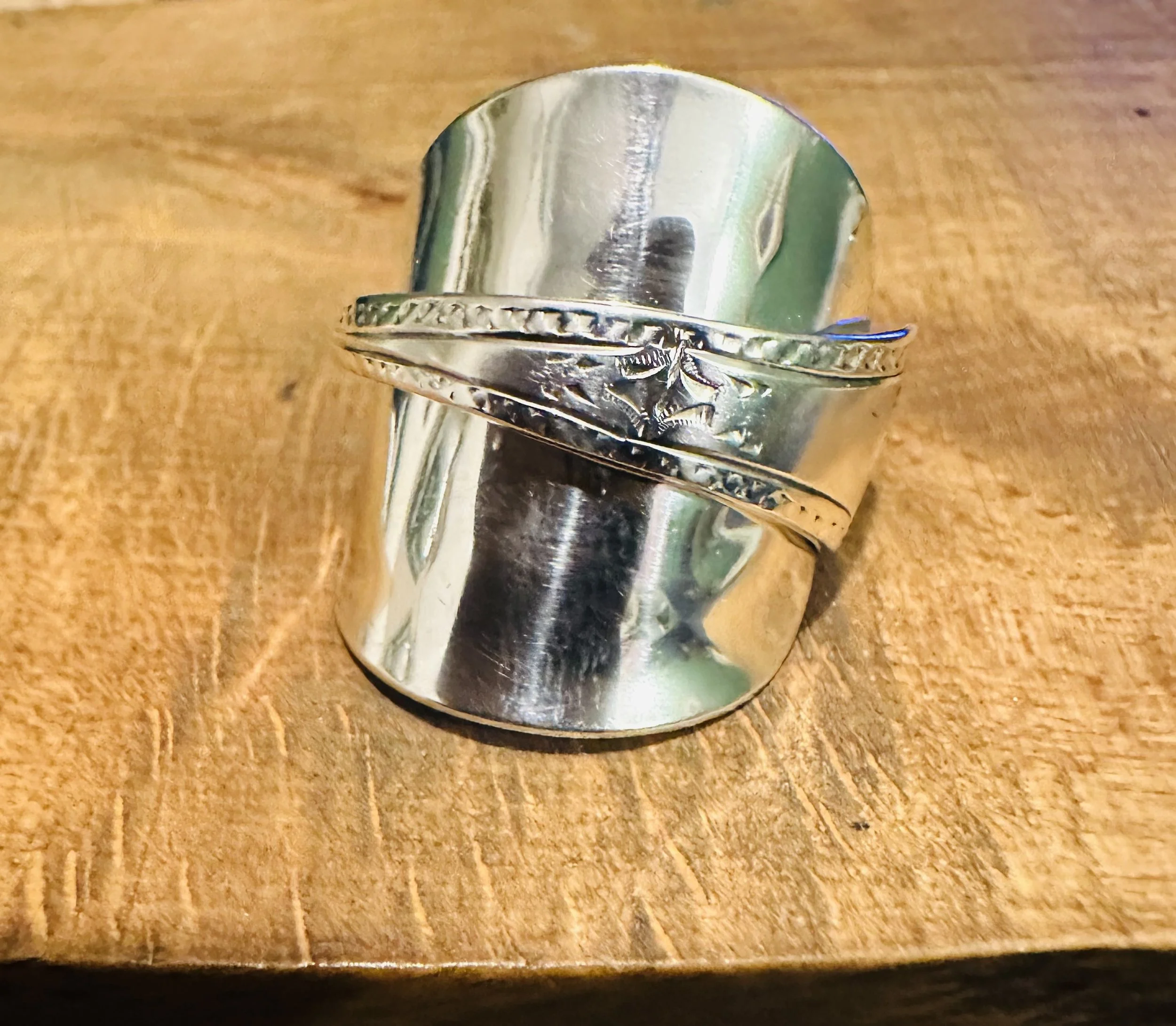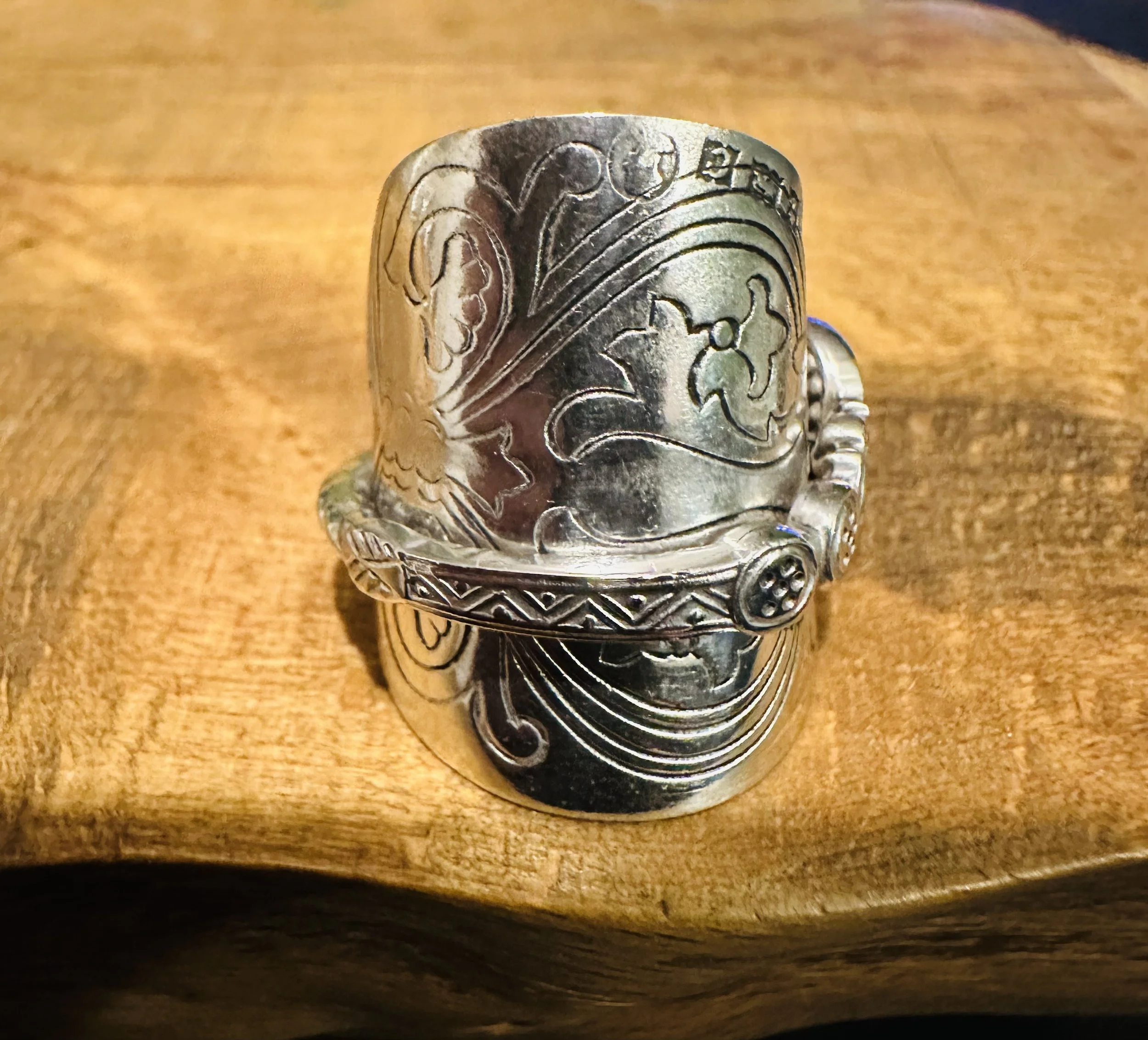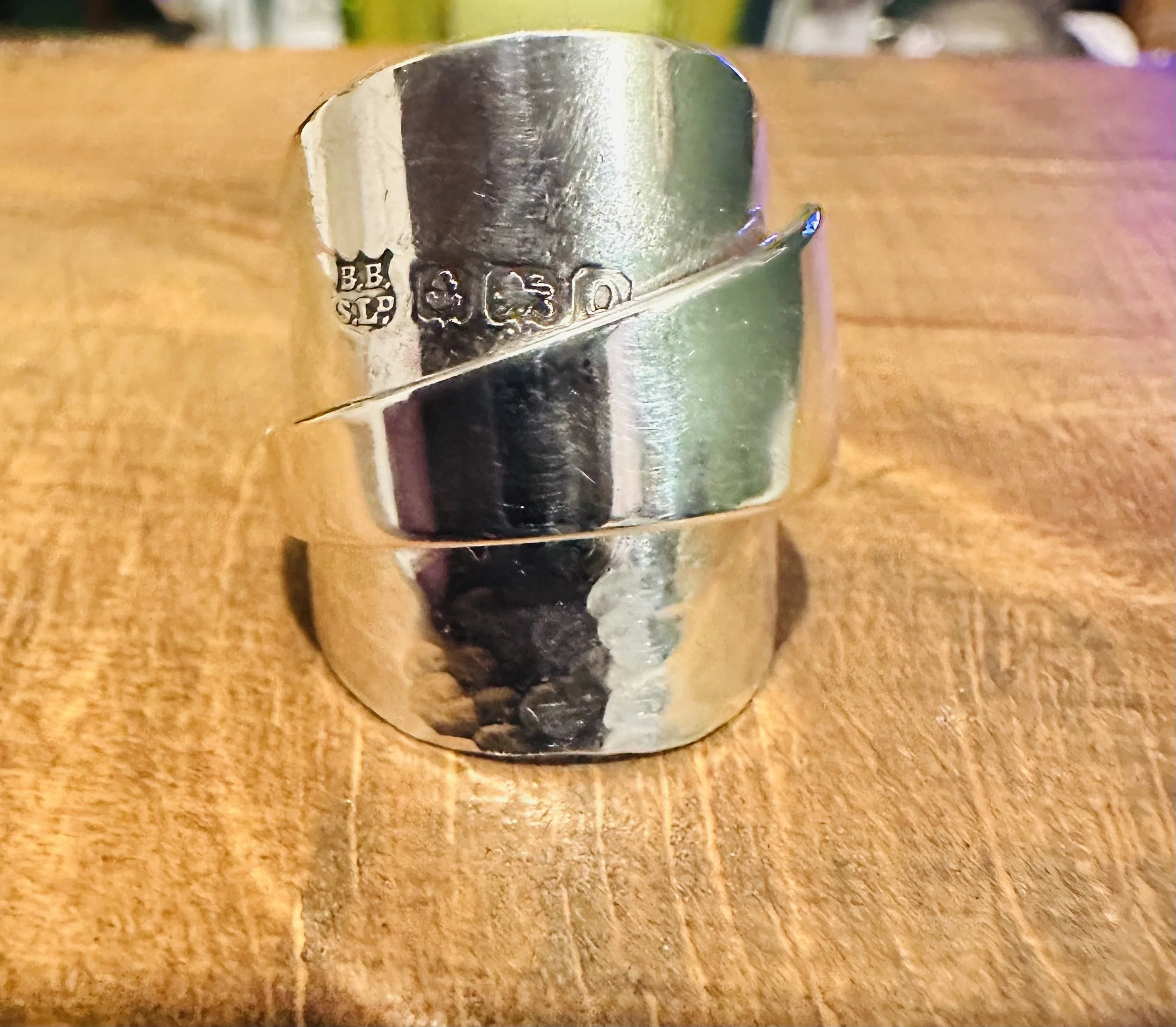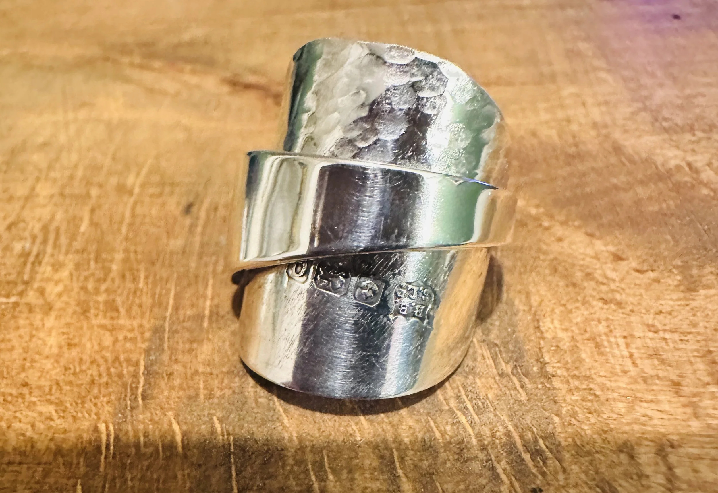 Spoon ring handcrafted from a Sheffield 1915 silver coffee spoon with pretty detailing on the handle. The spoon bowl has been gently hammered