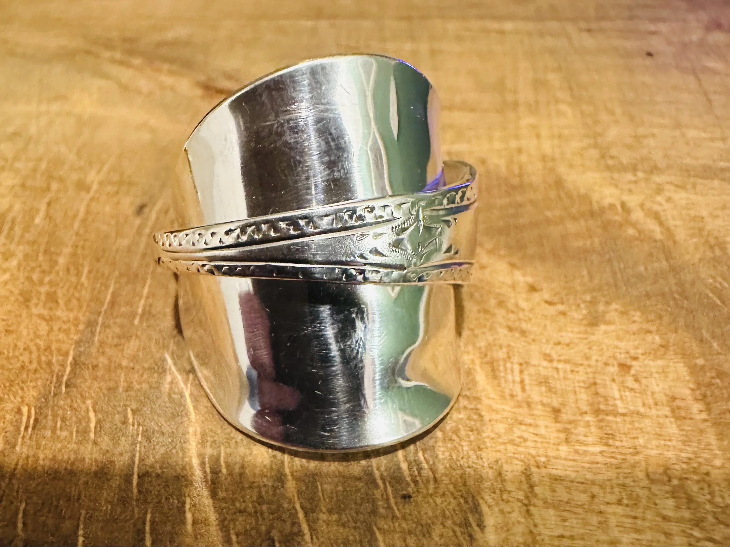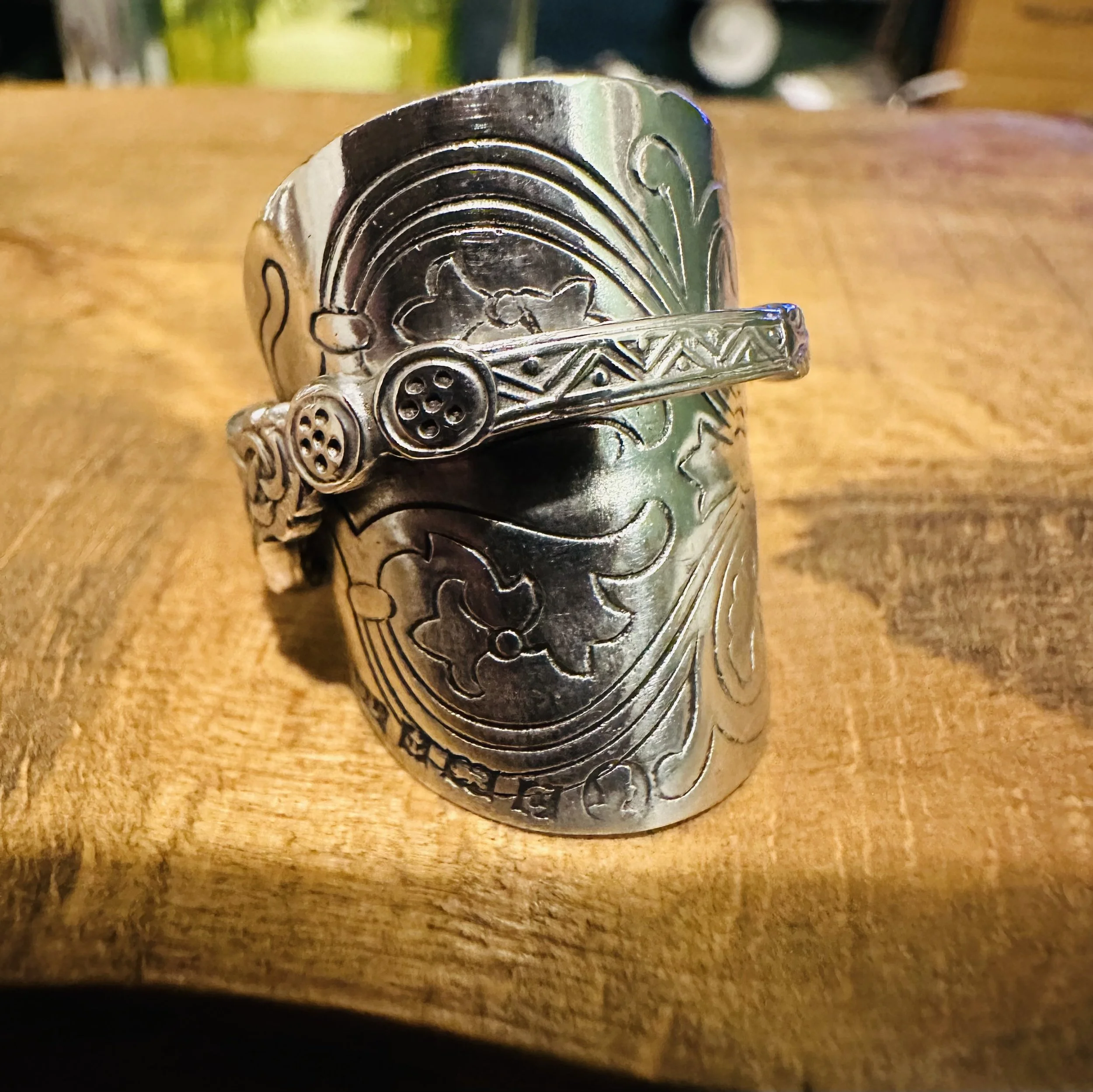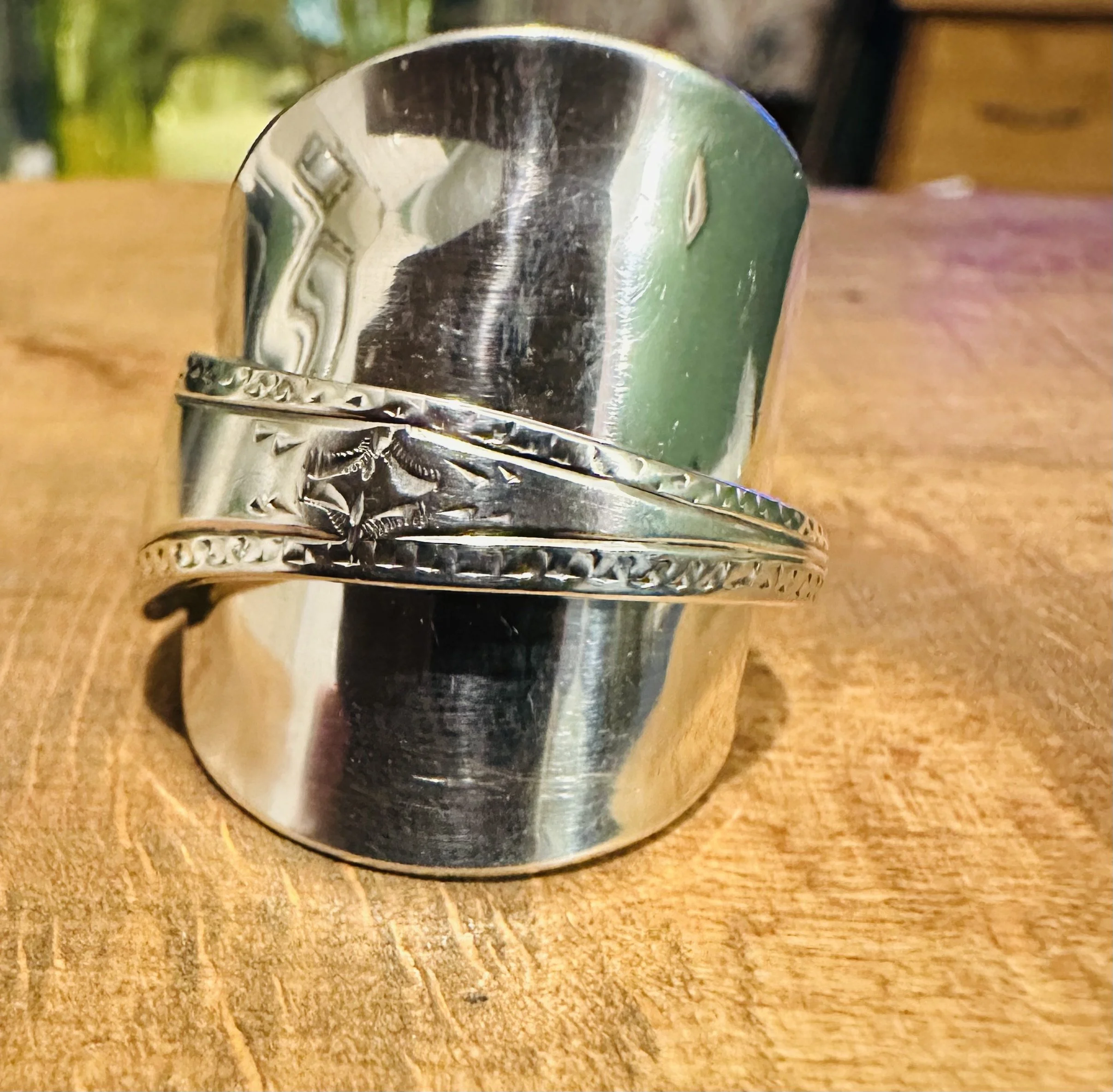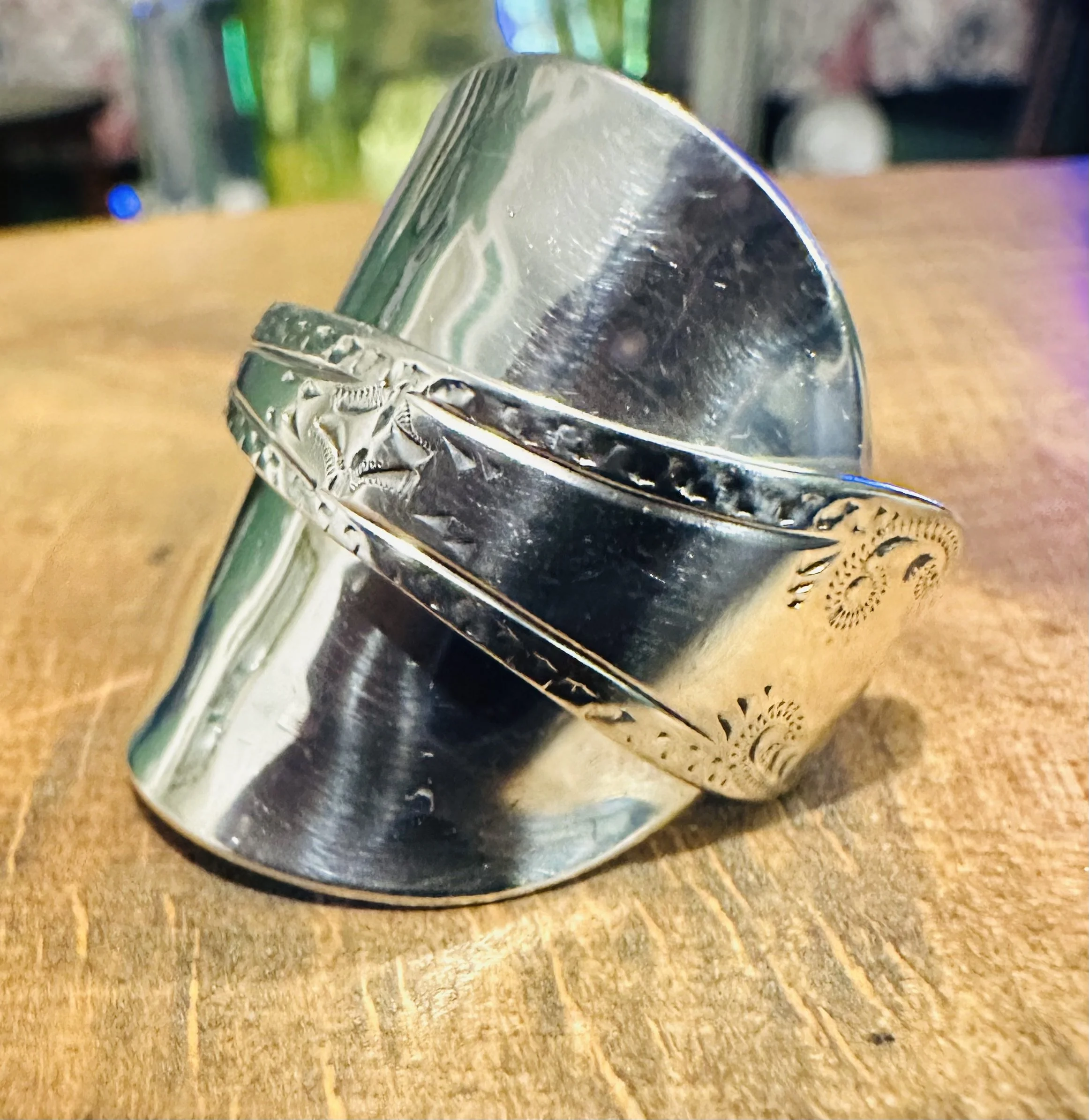 Spoon ring handcrafted from a Sheffield 1915 silver coffee spoon with pretty detailing on the handle. The spoon bowl has been gently hammered