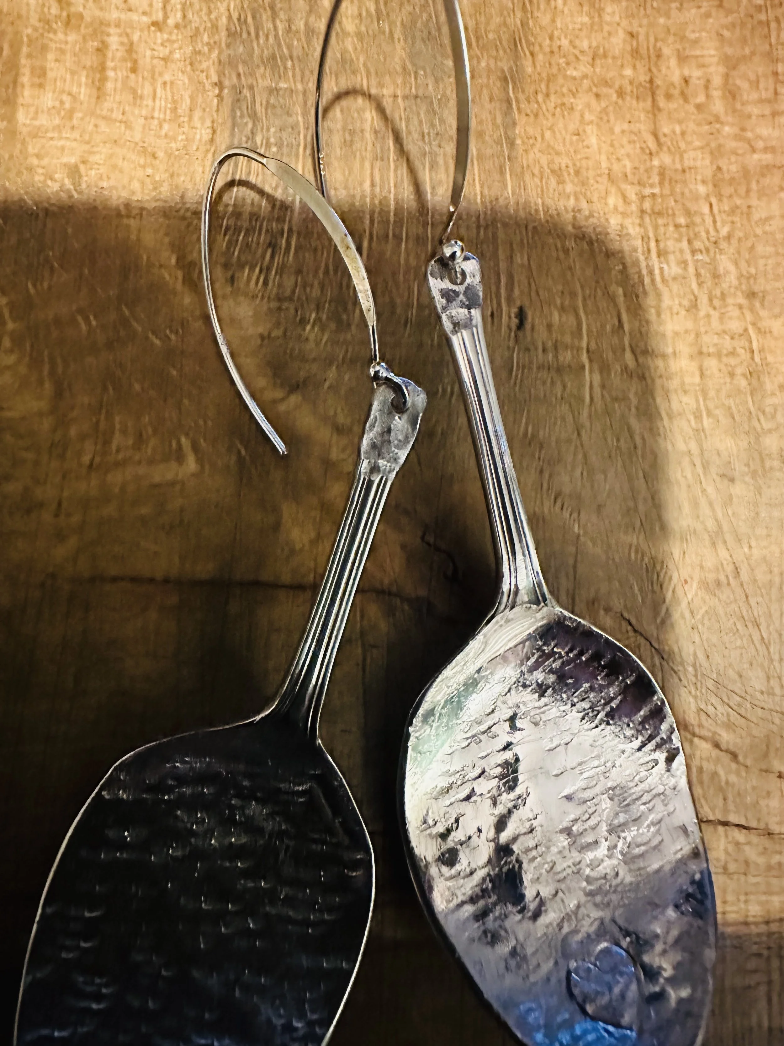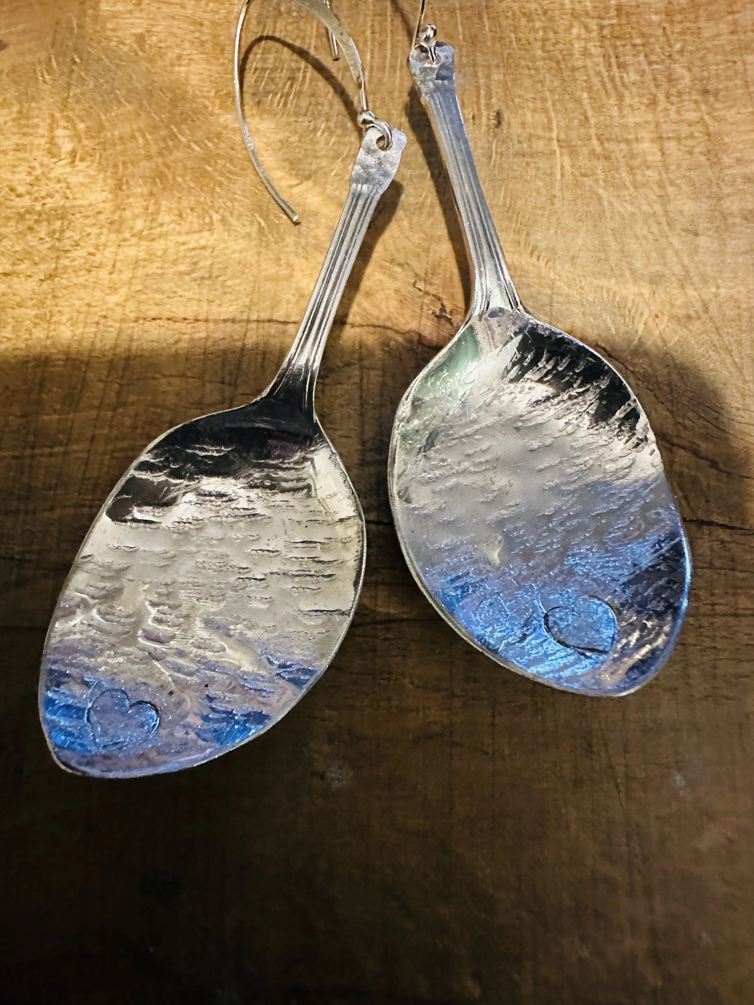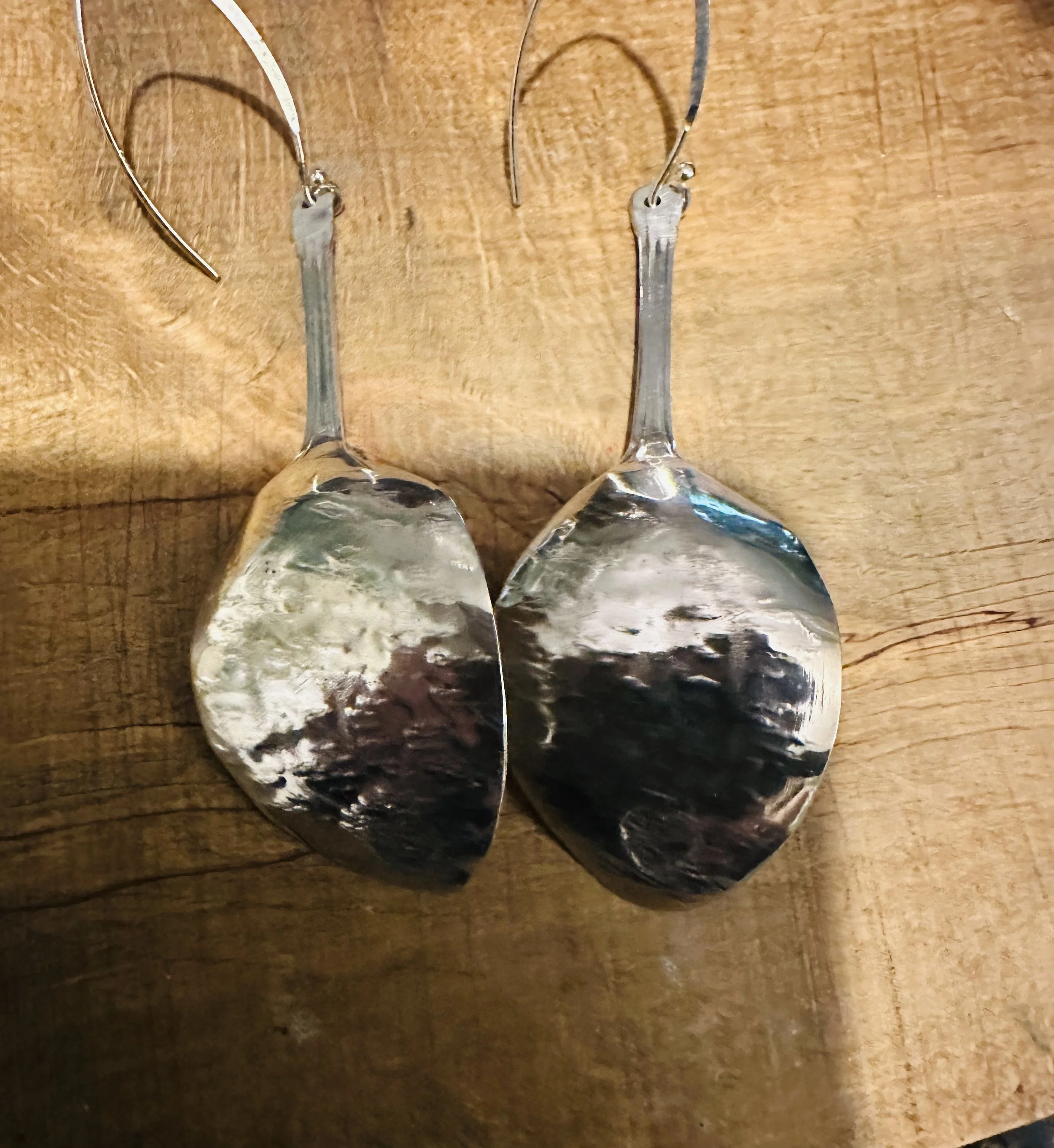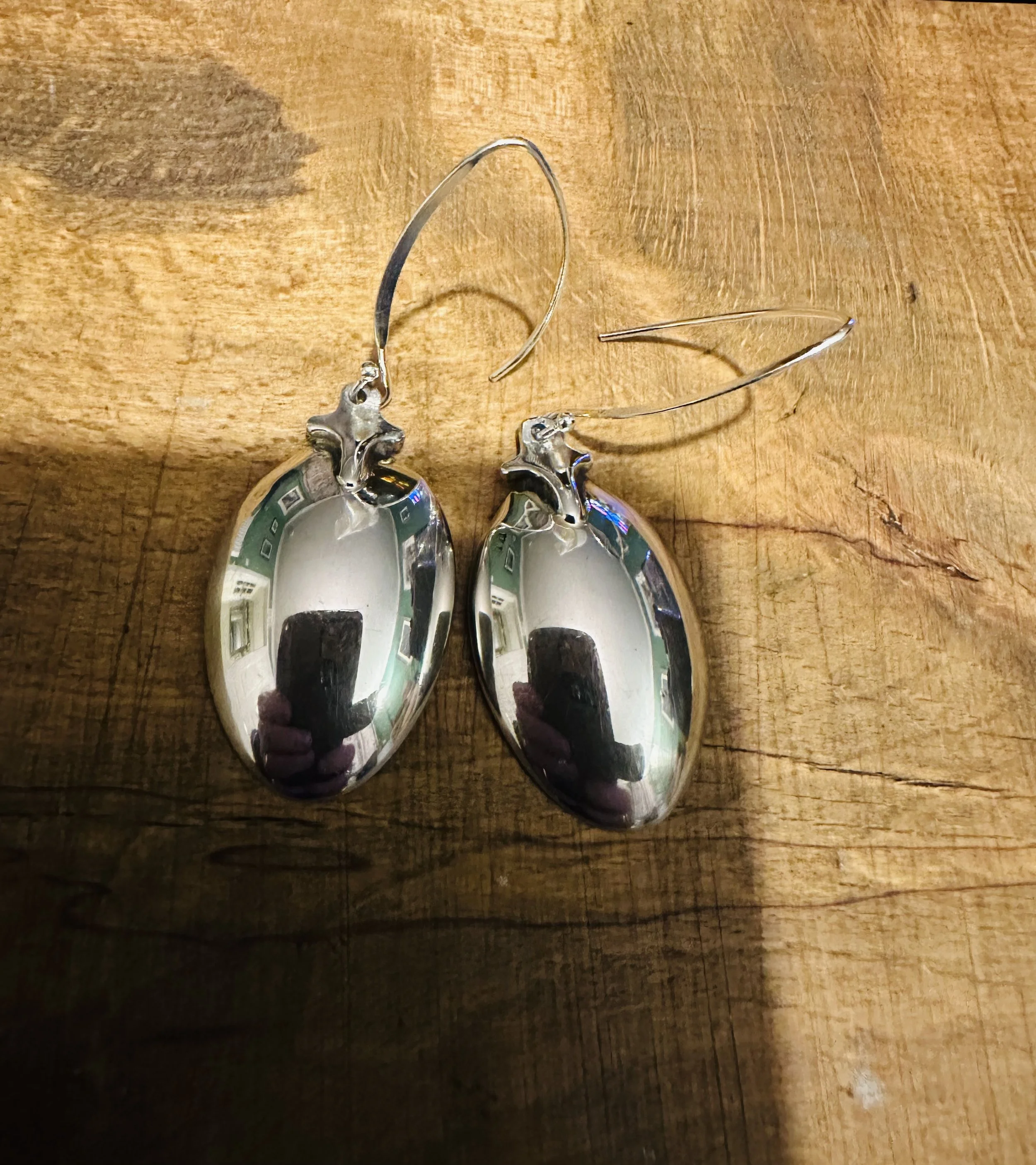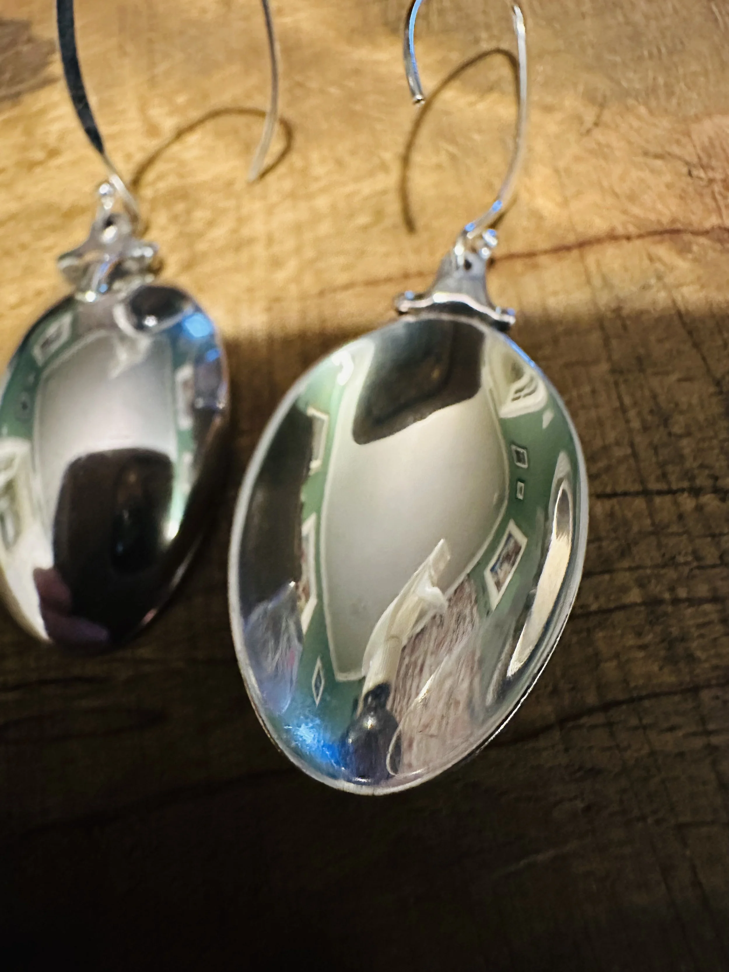 These pretty earrings have been handcrafted from silver spoon handles. They have a lovely design & added plenishing makes them attract the light